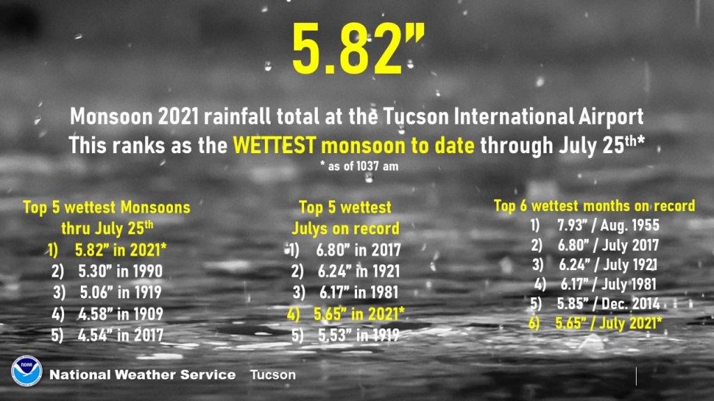 2020 was a summer of drought and wildfires. We continued to hope for rain as our mountainsides went up in fire and smoke. It was marked as the driest summer since 1895, having only 2.97 inches of rainfall. Seeing this year’s monsoon season was an extension of relief that 2021 has brought me all while observing record rainfall! As of July 25th we’ve experienced over 5.82 inches of rain here in Tucson. Almost twice as much as last year’s total. So far this year ranks as the 4th wettest July and 6th wettest calendar month on record!