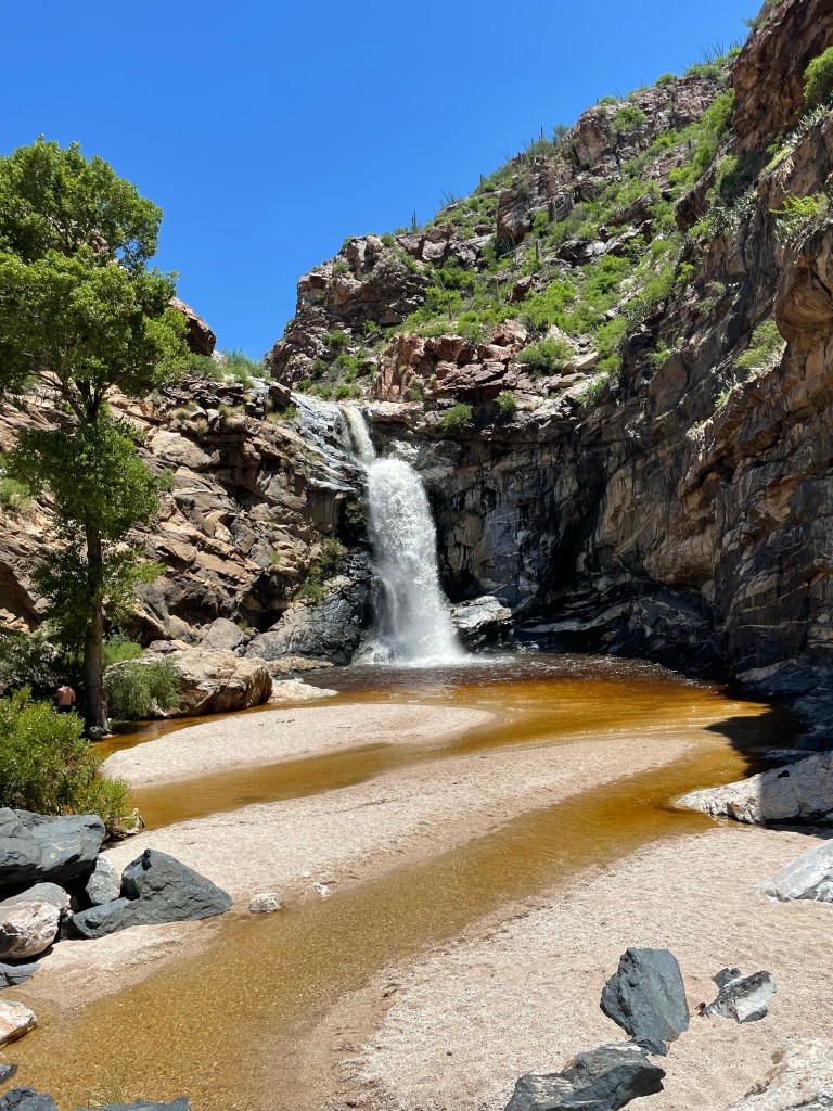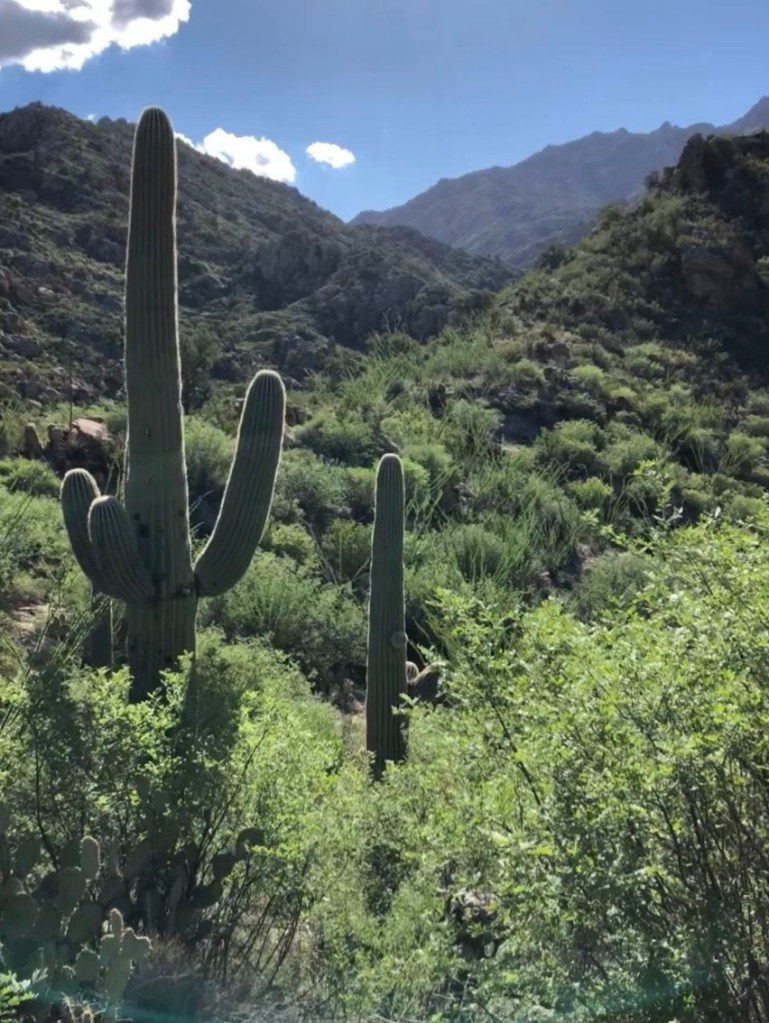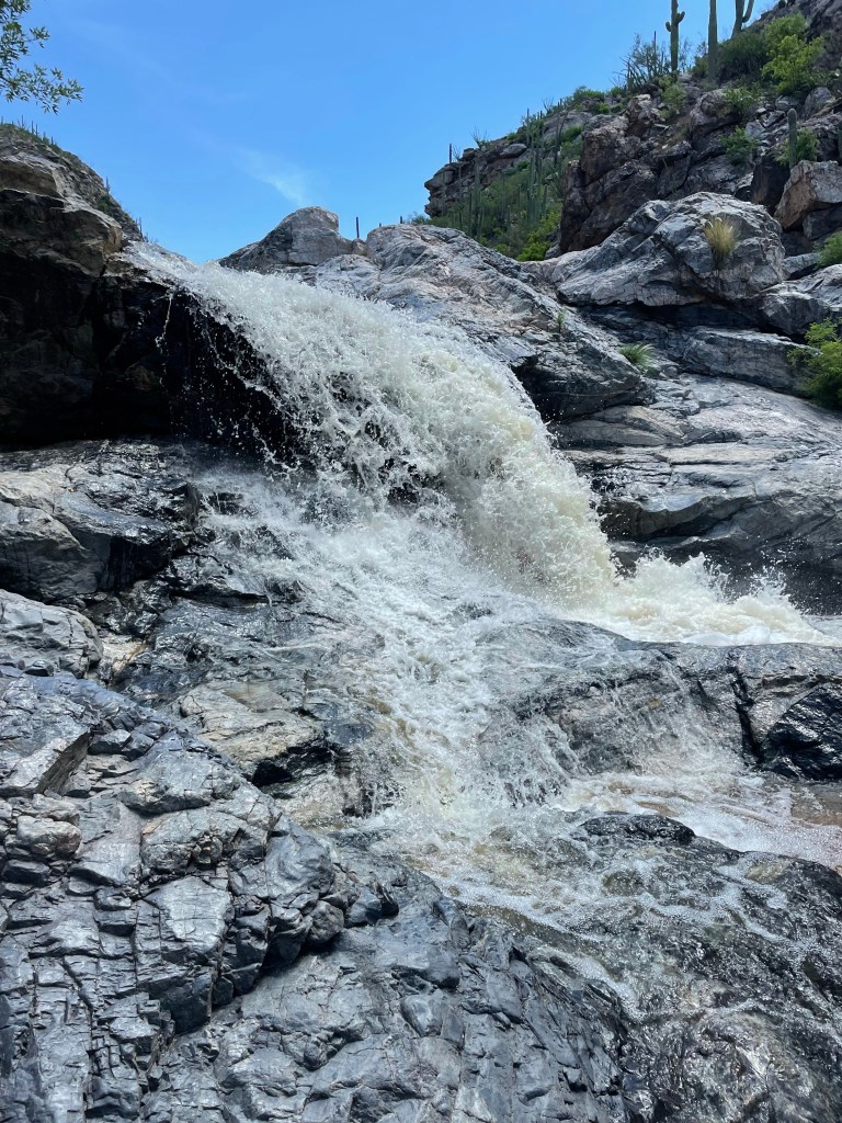 One of my favorite things as a desert dweller is to recreate during monsoon season! It’s a time where we can see the desert thrive and become even more green again, swim in vernal pools in canyons, and visit waterfalls to listen to the force of water here in the desert. Some of my favorite places to visit include Tanque Verde Falls, Sabino Canyon, Romero Pools, and the Cataracts along Mount Lemmon Scenic Byway. Typically it is always stressed to think about water and safety while hiking in the summer. This is still true during monsoon season, but in a different way in comparison to our dry summer. Yes, stay hydrated! But also be aware of the place you’re hiking and what potential there is for flash floods. Some great safety tips include looking at not only the weather forecast, but as well as the radar, research the area, and if available, talk to a park ranger to better understand what to expect!