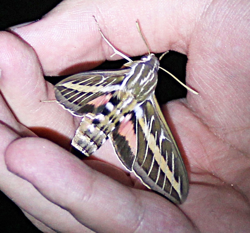 The moth seemed to feel secure in the palm of Ethan’s hand and began to quiver. In just a couple of minutes it spread its wings and took off. Interestingly, it hovered around our ultraviolet light for only a short time before flying away. Other sphinx moth visitors came and went. Meanwhile dozens of tiny moths remained enthralled by our UV light. The big guys, however, sized up our outpost quickly and departed. They weren’t about to waste precious body heat hovering around a nectarless lightbulb. They had things to do and places to go – while their temperature gauges registered 96 degrees.