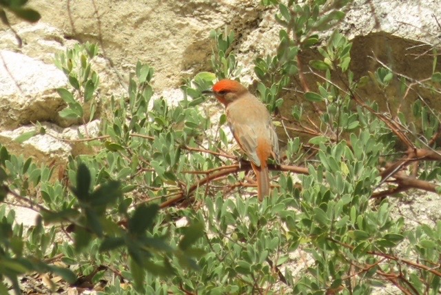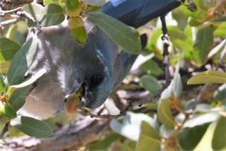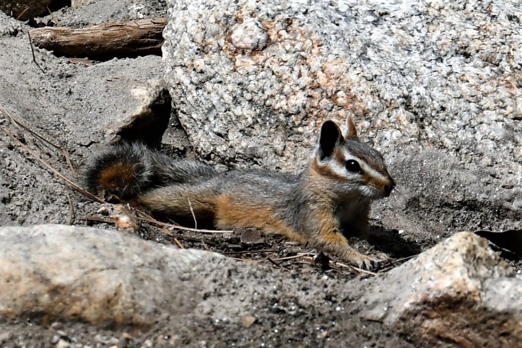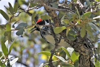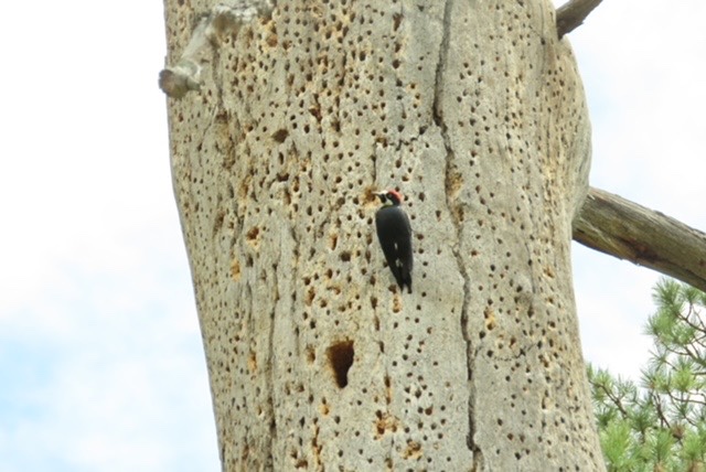 This area was criss crossed by a sandy wash, oaks and alligator pines, and low shrubs. A cacophony of noise from Mexican Jays and Acorn Woodpeckers greeted us and provided excellent photographic opportunities. A cliff chipmunk took a dust bath in the wash while a Hepatic Tanager hopped from one shrub to another. His yellow feathered mate flew past but stayed hidden.