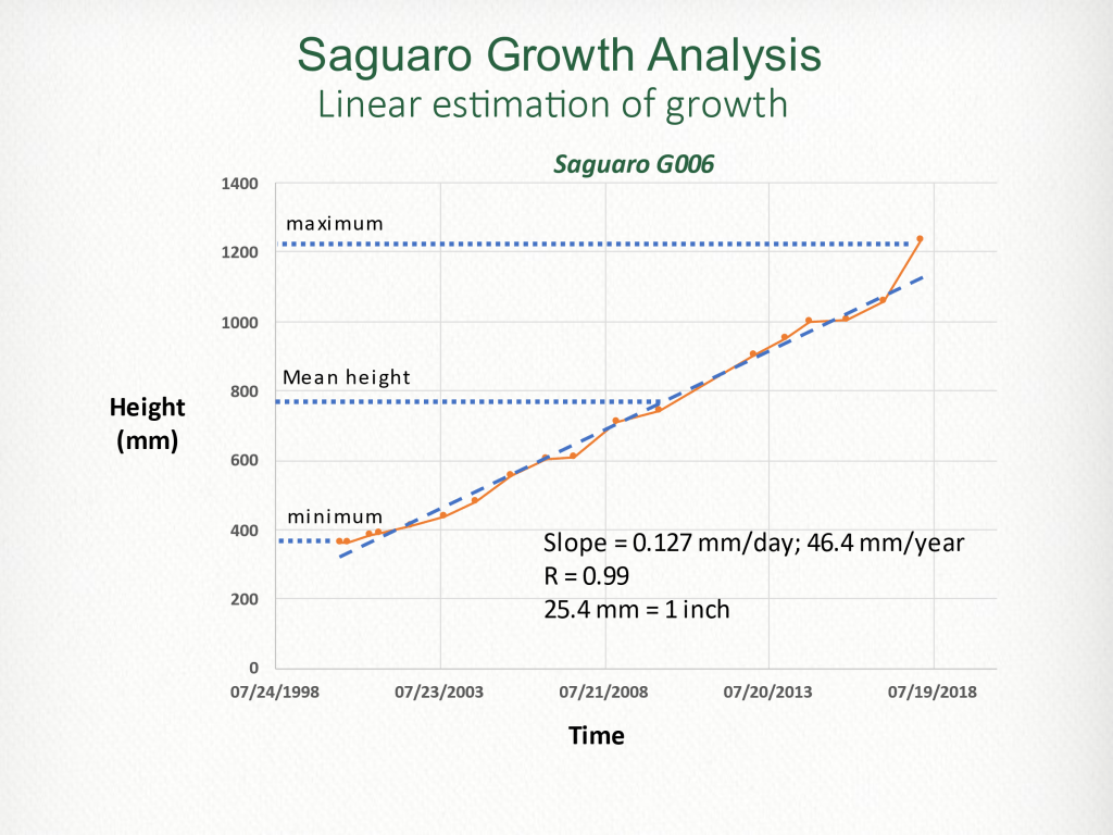 In 2019, the growth rate of each of these 186 saguaros was determined using Excel’s linear regression function and graphics as depicted in the figure below for Saguaro G006. The slope of the blue dashed line is the growth rate (mm/day or mm/year). The mean height was calculated according to the equation: