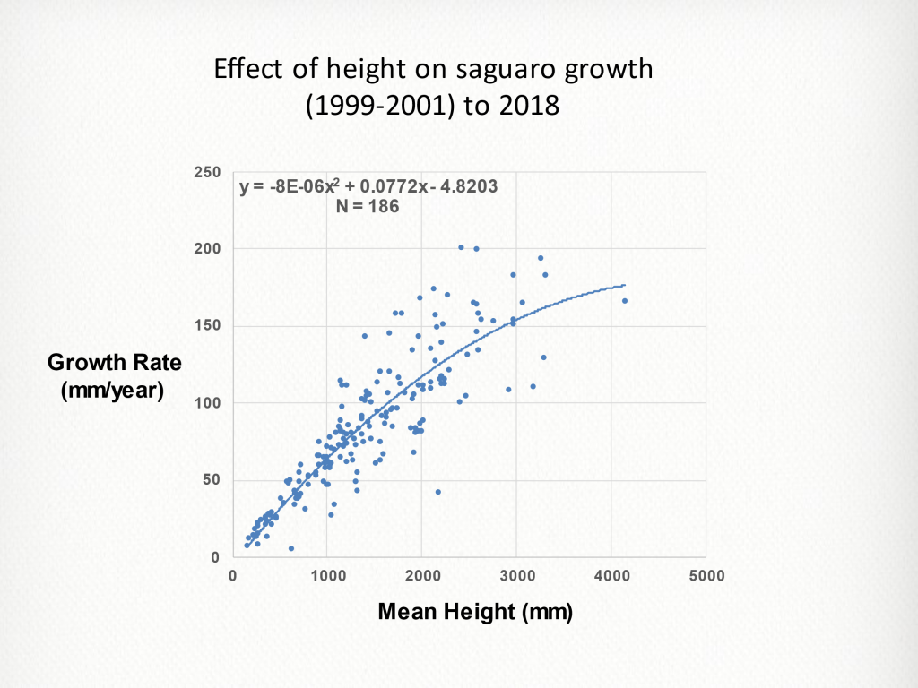 The figure demonstrates that saguaro annual growth rate is directly related to mean saguaro height. The increase in data scatter as mean height increases and a bending of the curve suggests that other variable besides height come into play. Those variables could include: arm development; injuries from freezing, insects, bird holes etc.; variations in weather including precipitation, temperature, evapotranspiration, etc.