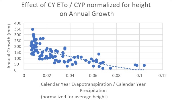 The graph below shows the curvilinear (exponential) relationship between CY ETo / CYP and annual growth.