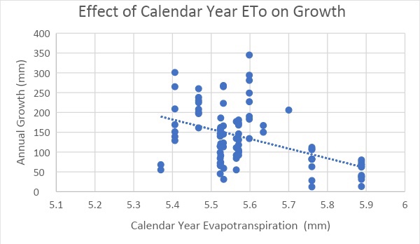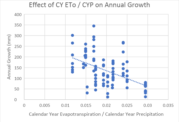 Note that the correlation between annual growth and the CY ETo / CYP ratio (0.4976) was less than the correlation between CYP and annual growth (0.6369) suggesting that the addition of ETo as a variable failed to improve the correlation.