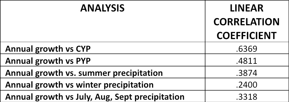 We determined the correlations between annual growth and summer, winter, monsoon, CYP, and PYP for the 11 fast-growing saguaros. The results of these analyses are summarized in the table below.