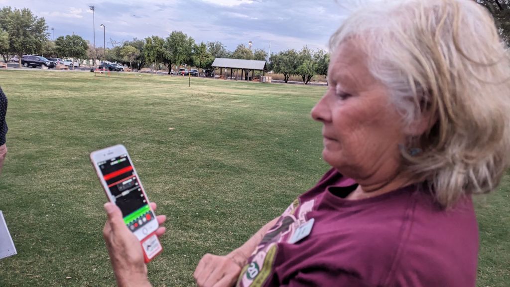 After the presentation, participants grabbed their phones and tablets and used the “Echo Meter: device and software” to listen for and identify bats.