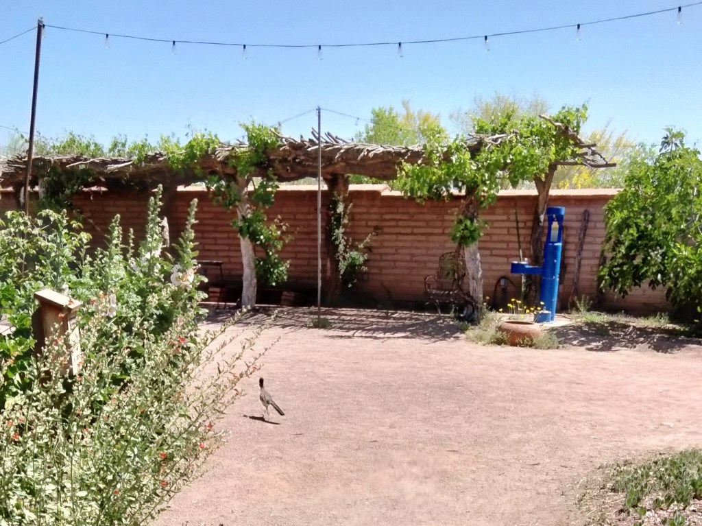 The black shiny eye of one reflected at me. We call all the roadrunners at Mission Garden Kevin,