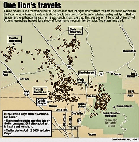 In addition, during his presentation, Dan shared a map provided to him by the Arizona Game and Fish Dept. showing the home ranges of 3 collared mountain lions under study, and mentioned that a male mountain lion’s home range in the Sonoran Desert could cover 300 to 400 square miles. Since that time, he then came across another map (see below) showing the travels of another male puma under study. This cat’s travels covered some 600 square miles in 8 months, including the Picacho, Tortolita, Santa Catalina and Black mountain ranges.