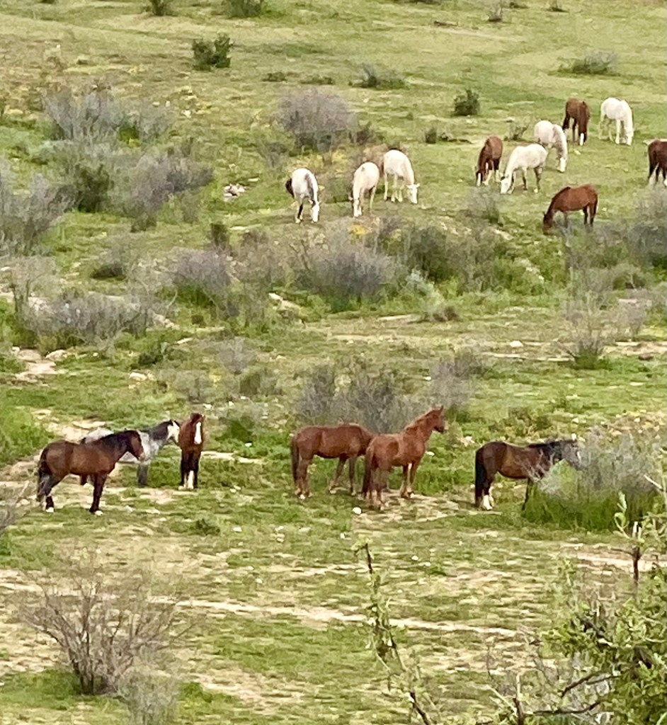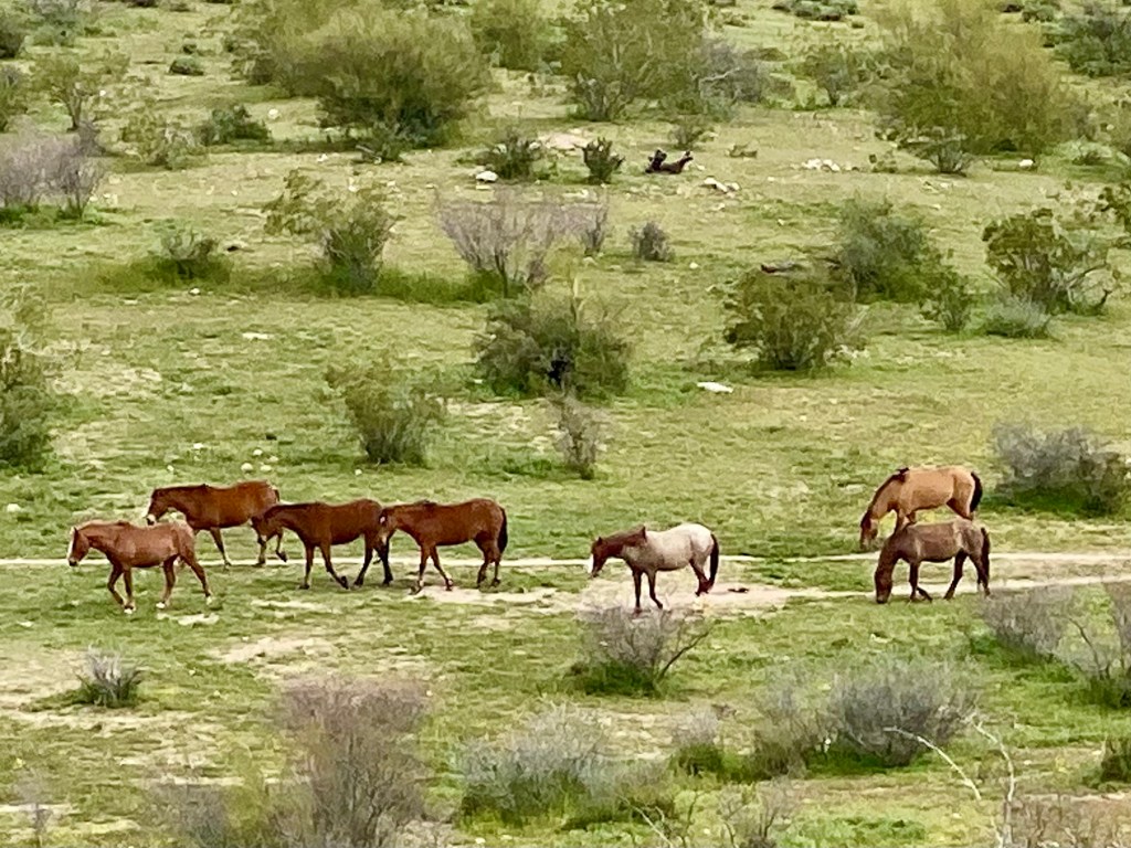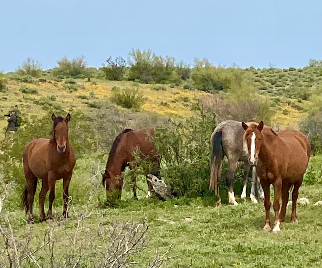 At each stopping point along the way we would get out and wander down to the Salt River and walk along in search of these majestic beauties. Our first 3 stops were unsuccessful and we were wondering if this may have been a long trip for nothing. But it was a beautiful day, slightly overcast at times and the wildflowers were in bloom so it didn’t seem like a total loss. Once we passed Saguaro Lake we discovered cars parked along the highway and off to our left we saw a small band of horses! We quickly found a place to pull off and wandered back to observe with our binoculars and cameras with telephoto lens. This was a small band of approximately 30 horses – mostly grazing on grasses with a few laying down and resting in the wildflowers. It felt like we hit the lottery.