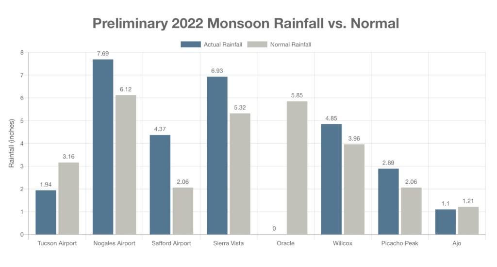 The Arizona Upland subdivision of the Sonoran Desert is our wettest desert region. A stark comparison to Yuma, one of the driest places on Earth, averaging only 3 inches of rain each year. The past three years we’ve experienced how rainfall in the desert is unpredictable. Plants and animals here have adapted to wait, reserving energy for when resources are most available to procreate. In 2020 we experienced a drought, receiving only 1.62” of rain for the entire summer monsoon season. This was followed by one of the wettest Julys on record, bringing in over 12 inches of rain for the 2021 July season. According to the National Weather Service, June 2022 has been the 5th warmest and 38th wettest monsoon season. You can also track our current 2022 monsoon reports via the NOA website!